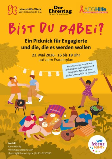 Gemeinsam mit dem Lebenshilfe-Werk veranstaltet der AIDS-Hilfe Weimar & Ostthüringen e.V. ein Picknick für Engagierte. Informiere Dich dort über Engagement-Möglichkeiten und lerne dabei aktive Ehrenamtliche kennen.