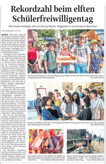 "Eigentlich nicht mehr zu Schaffen", sagt Stefanie Lachmann, Koordinatorin des Schülerfreiwilligentages für Weimar, über den 11. Aktionstag. Aber die Mühe der Organisation lohnt sich, wenn etliche junge Menschen die Möglichkeit bekommen, mal andere Aufgaben wahrzunehmen, andere Menschen außerhalb des normalen Lebensalltags kennen zu lernen und dabei erfahren, wie groß die Vielfalt an gemeinnützigen Einrichtungen in Weimar und deren Einsatzmöglichkeiten zum Mithelfen sind.