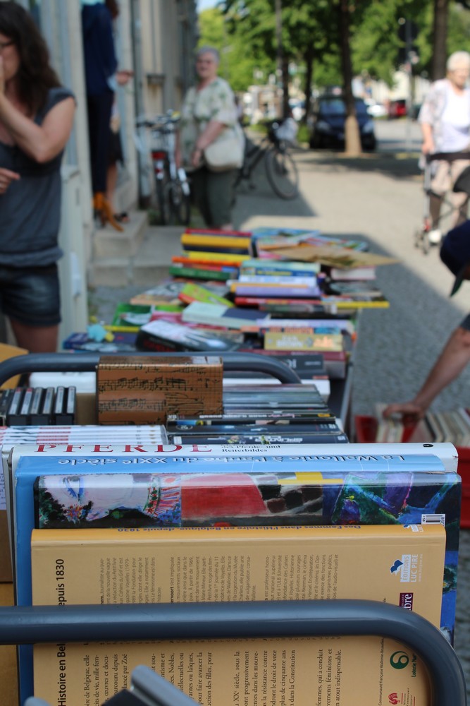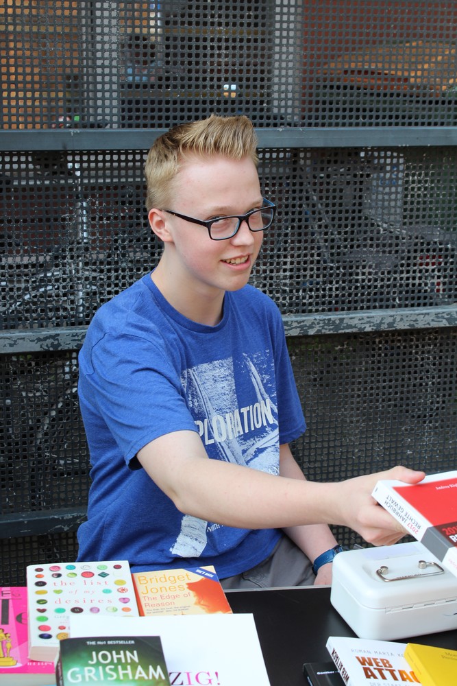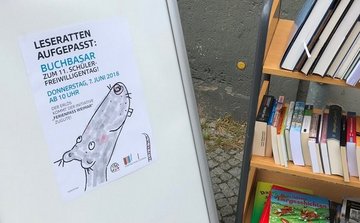 Bei gutem Wetter findet dieser direkt vor den Pforten der Bücherei statt und lädt Passanten ein, gegen Spende, Lesestoff zu erwerben. Es werden ausschließlich Buchgeschenke, die die Bibliothek von Lesern erhalten hat, veräußert. Die Auswahl reicht vom Bildband, über Krimis, bis zum Kinderbuch. In zwei Schichten betreuen jeweils 2 Schüler*innen, von 10.00 – 16.00 Uhr, den gut frequentierten Verkaufsstand.