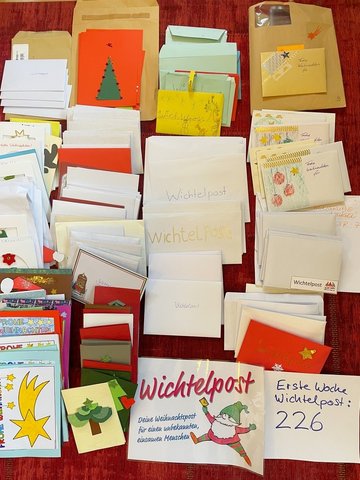 Die erste Woche unserer Aktion ist schon sehr gut angelaufen. Wir bedanken uns herzlich bei allen, die bisher kreativ geworden sind und ihre schönen Karten, Briefe, Bilder und berührenden Texte an die Wichtelpost gespendet haben. Toll!