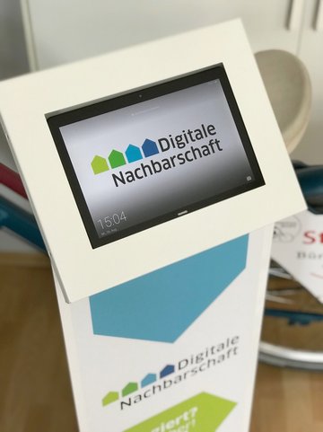 Zum schicken Ständer für die Informationsmaterialien der Digitalen Nachbarschaft (DiNa) hat sich nun auch ein DiNa-Tablet-Ständer in die Beratungsstelle in der Teichgasse gesellt. Denn wir haben gewonnen!