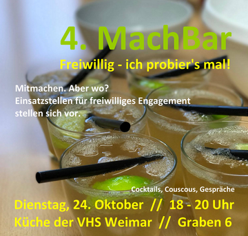 Die MachBar ermöglicht Einsatzstellen und interessierten Freiwilligen, in lockerem Rahmen zusammen zu treffen. Nach einem alkoholfreien Begrüßungscocktail stellen, in jeweils 10 Minuten, 4 Einrichtungen ihre Aufgaben für Freiwillige vor. Beim anschließenden Couscous-Essen können Fragen gestellt und persönliche Kontakte geknüpft werden.