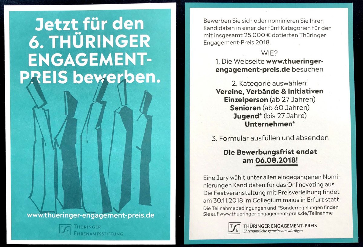 Bewerben Sie sich oder nominieren Sie Ihren Kandidaten in einer der fünf Kategorien für den mit insgesamt 25.000 € dotierten Thüringer Engagement-Preis 2018. Eine Jury wählt unter allen eingegangenen Nominierungen Kandidaten für das Onlinevoting aus.