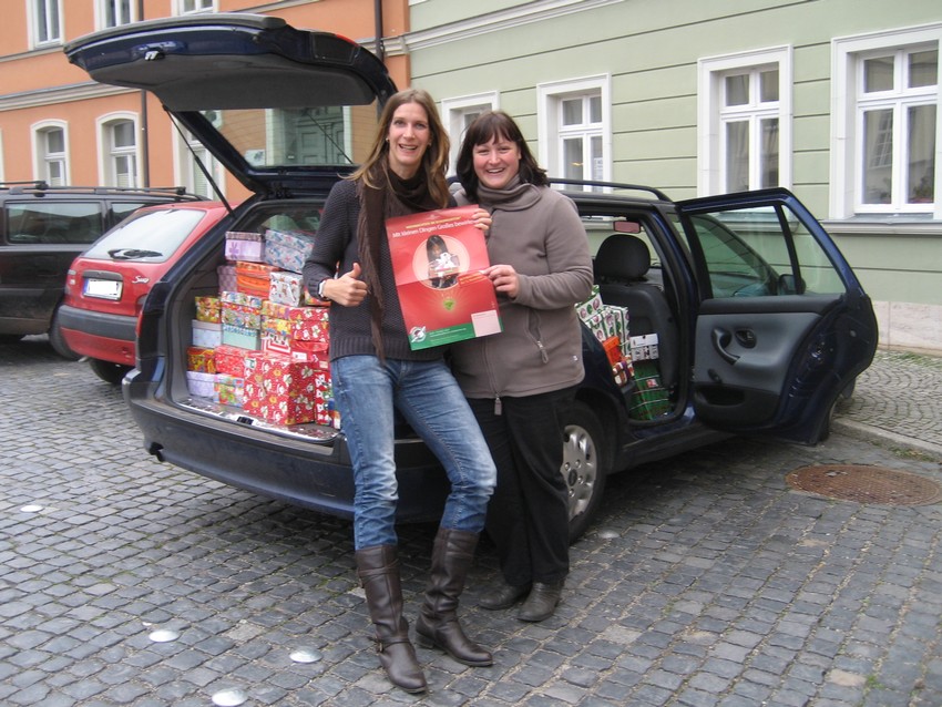 Katrin Küchler vom Vorortorganisationsteam der Sammelaktion "Geschenke der Hoffnung" oder auch „Weihnachten im Schuhkarton“ spielte Echtzeit-Tetris mit den Päckchen und ihrem Kombi. Geschickt gestapelt passten alle 88, der allein in der Teichgasse abgegebenen Pakete, ins Auto.