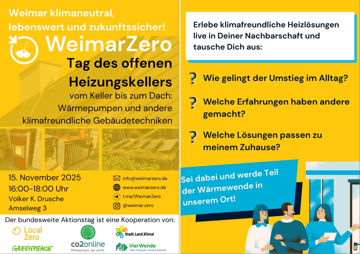 Einladung zum Tag des offenen Heizungskellers am 15. November 2025. Im Rahmen des bundesweiten Aktionstags, der in Kooperation von greenpeace, co2online mit VierWende, Stadt.Land.Klima, dem For Future Bündnis und LocalZero organisiert wird, wird gezeigt, wie klimafreundliches Heizen heute schon funktioniert.